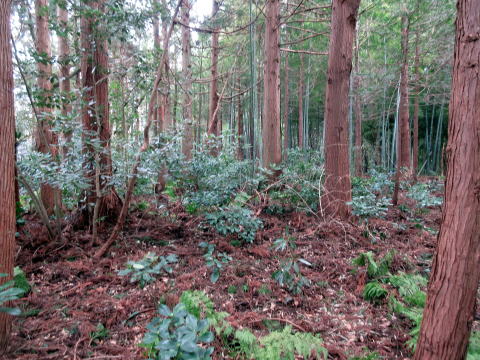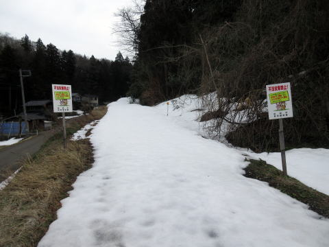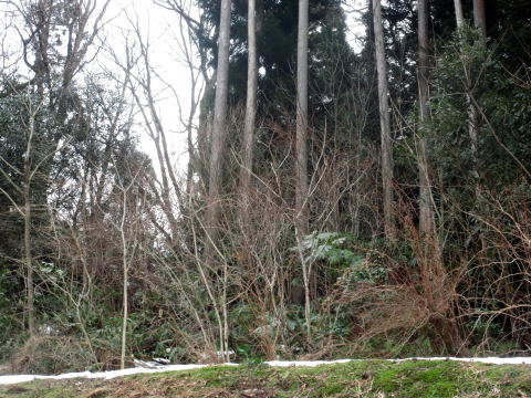 | 雪のある林道で取り付き地点へ | 斜面の藪の状況 |